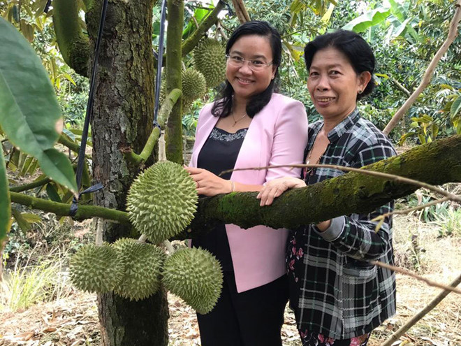 Bà Hương (phải) hướng dẫn Bí thư Huyện ủy Cao Lãnh Huỳnh Thị Hoài Thu tham quan vườn sầu riêng của gia đình. Ảnh: Trần Ngọc